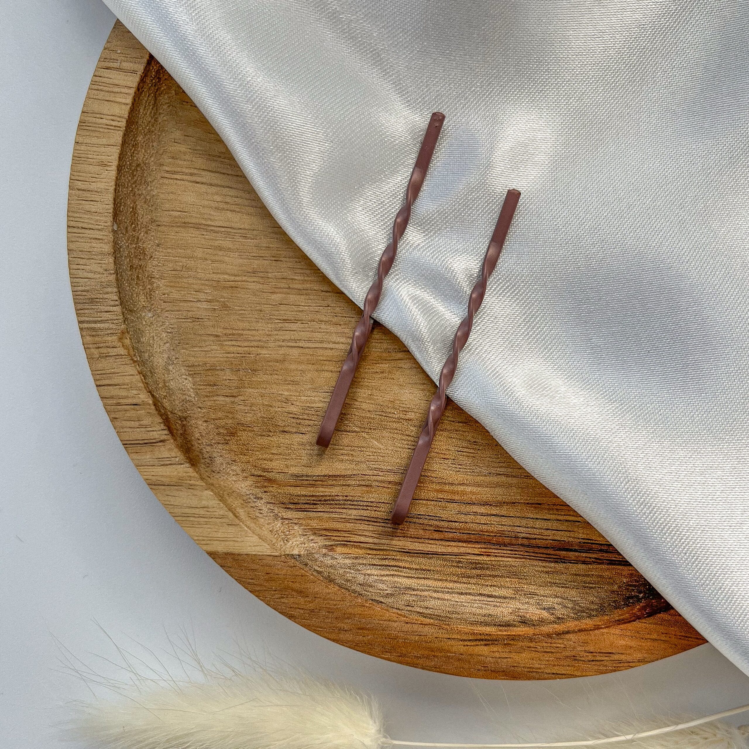 Благородный розово-коричневый оттенок сочетает в себе мягкость розового и глубину коричневого тона. В наборе одна пара невидимок длиной 5,5 см. Они надежно фиксируют волосы, не сползают и не красят ткань. Закрученная форма делает их удобными в использовании и аккуратными в прическе. Такой оттенок идеально подойдет для гармонии с косынками теплой и натуральной цветовой гаммы, добавляя образу утонченности и сдержанности.